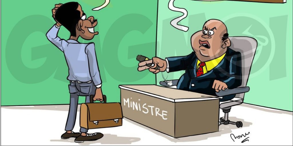 Ensuite, son attitude mériterait une double peine, si les comptes de son ministère venait à être en déficit. Ces pratiques sont courantes en Afrique, parce que les contrôles sont presque inexistants. À coup d’intimidations comme sur ce dessin de Manu, on arrive à écarter le danger et continuer à tromper la vigilance des caisses de l’état. Certains haut responsable vont jusqu’à commanditer des assassinats, parce qu’un simple agent des impôts a eu la malchance de mettre son nez là où il n’aurait pas fallu le faire.