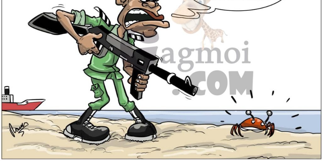 Avec une mer très agitée et pas accueillante, les autorités togolaises ont décidé d’interdire la baignade sur les plages non aménagées. Alors, il faut bien des corps habillés pour la surveillance ! Le caporal gagmoi, en mission depuis 6 h du matin et exténué, manque de peu, d’allumer un crabe sorti prendre de l’air.