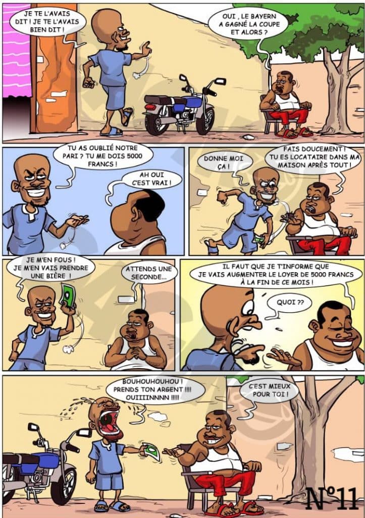 Tu t’attendais à quoi ? Qu’on te remette 5 000 francs ? Le pire, c’est qu’il lui dévoile son envie d’aller siffler une bière. Malheureusement, le propriétaire aime également la bière. Son ventre peut en témoigner ! Car il porte l’étiquette d’une brasserie (Drogba). Tu ne vois pas bien ou tu fais semblant de ne pas voir ? Le hasard est dans ta tête sauf que pour l’adversaire, ce ne soit pas le cas. Ça t’apprendra pour la prochaine fois. Tu feras moins le malin avec ton proprio.